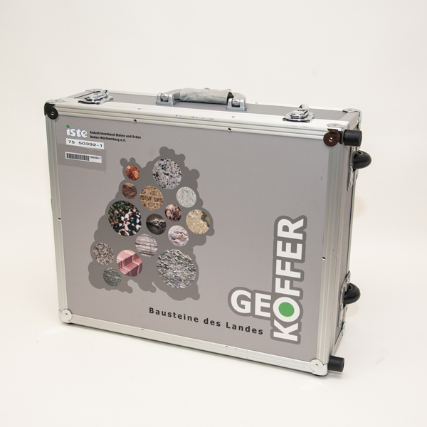Der Koffer beinhaltet die 14 wichtigsten Gesteinsorten Baden-Württembergs. Die handgroßen Steine sind naturbelassen und wurden lediglich an einer Seite angeschliffen, so dass ersichtlich wird, wie der behandelte Stein verwendet werden kann. Der USB-Stick im Geokoffer enthält zudem Unterrichts- und Anschauungsmaterial. Das Wissen und die Erfahrung aus Schulen, Universitäten, pädagogischen Hochschulen, dem Landesamt für Geologie, Rohstoffe und Bergbau und der Steine- und Erdenindustrie sind im Koffer gebündelt und mit multimedialen Anwendungen verbunden.